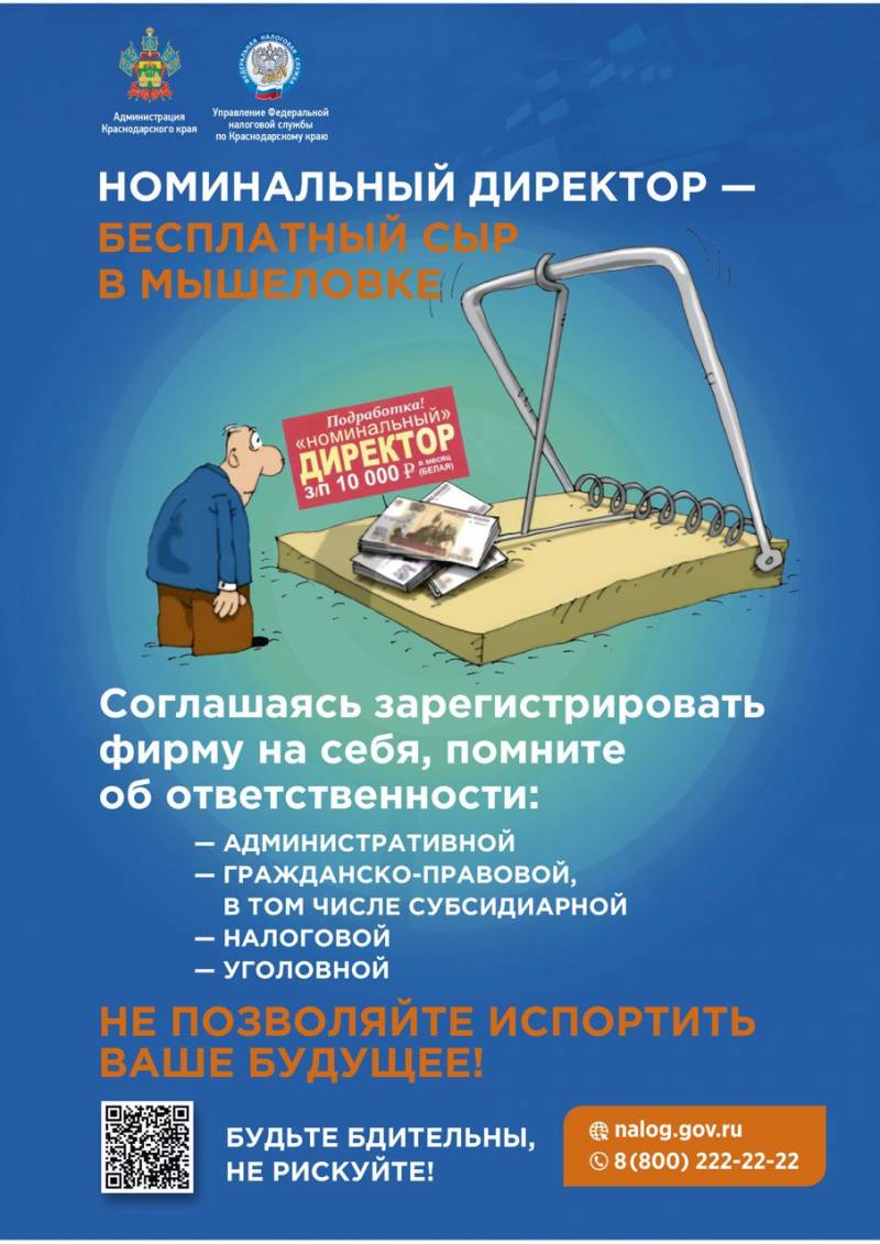 В своих сообщениях данные лица просят предоставить паспорт, ИНН, СНИЛС, Вашу подпись на пустом листе бумаги и иные документы. За предоставление такой информации предлагается денежное вознаграждение (одна или несколько выплат). Владея такими данными мошенники без Вашего непосредственного участия или присутствия получают возможность совершения следующих действий: - получение электронной цифровой подписи; - регистрация Вас в качестве самозанятого; - регистрация Вас в качестве индивидуального предпринимателя; - создание неограниченного количества юридических лиц; - открытие расчетных счетов и получение кредитов; - заключение фиктивных договоров; - фальсификация налоговой и бухгалтерской отчетности; - не законное обогащение и т.д. Инспекция напоминает, что за данные действия предусмотрена не только административная ответственность, но и уголовная: «Кодекс Российской Федерации об административных правонарушениях»: - Статья 14.25. Нарушение законодательства о государственной регистрации юридических лиц и индивидуальных предпринимателей «Уголовный кодекс Российской Федерации»: - Статья 170.1. Фальсификация единого государственного реестра юридических лиц, реестра владельцев ценных бумаг или системы депозитарного учета - Статья 173.1. Незаконное образование (создание, реорганизация) юридического лица - Статья 173.2. Незаконное использование документов для образования (создания, реорганизации) юридического лица - Статья 327. Подделка, изготовление или оборот поддельных документов, государственных наград, штампов, печатей или бланков. В связи с этим Межрайонная ИФНС России № 13 по Краснодарскому краю просит Вас быть бдительными, не вступать в переписку с данными лицами и не передавать кому-либо Ваши личные данные. | |