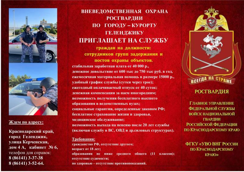 Вневедомственная охрана Росгвардии по городу – курорту Геленджику приглашает на службу